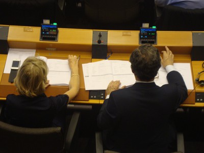 Två meppar som röstar för Cecilias betänkande (den gröna lampan visar att de röstar ja.)