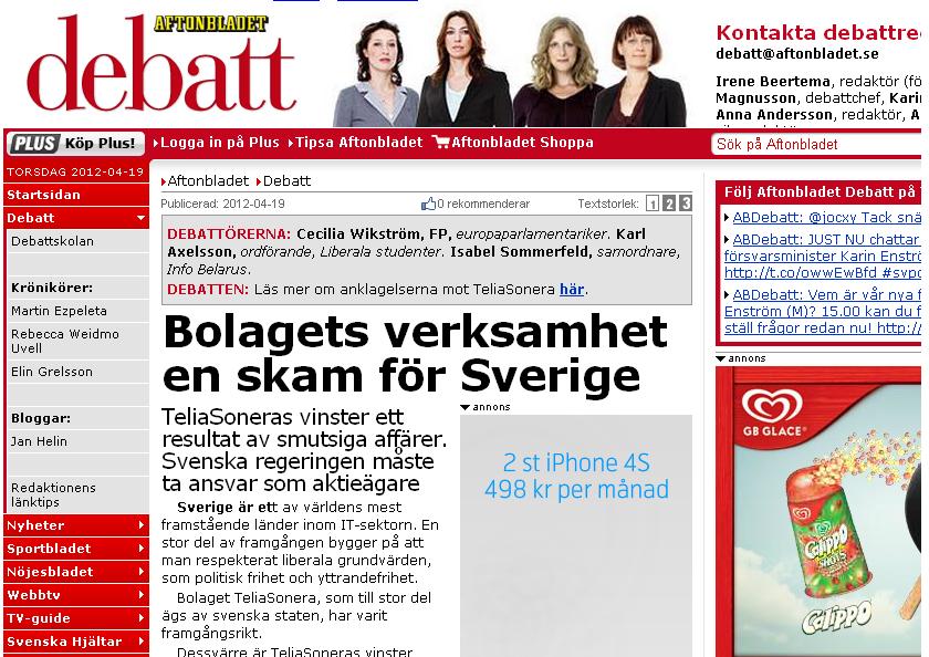Cecilia riktar skarp kritik mot att TeliaSonera säljer kommunikationsnät till diktaturer, såsom Vitryssland. ”Det är en skam för svenska skattebetalare. Jag kräver att regeringen sätter press på TeliaSonera att lämna Vitryssland”, säger hon bland annat.