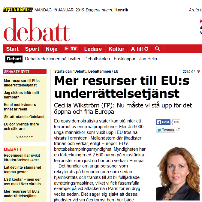 Debattartikel i Aftonbladet: ”Mer resurser till EU:s underrättelsetjänst”