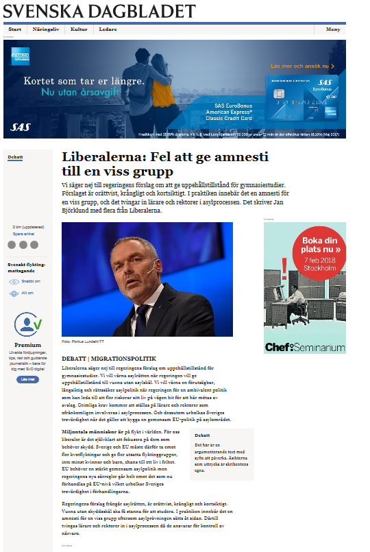 Debattartikel i Svenska Dagbladet: Liberalerna: Fel att ge amnesti till en viss grupp