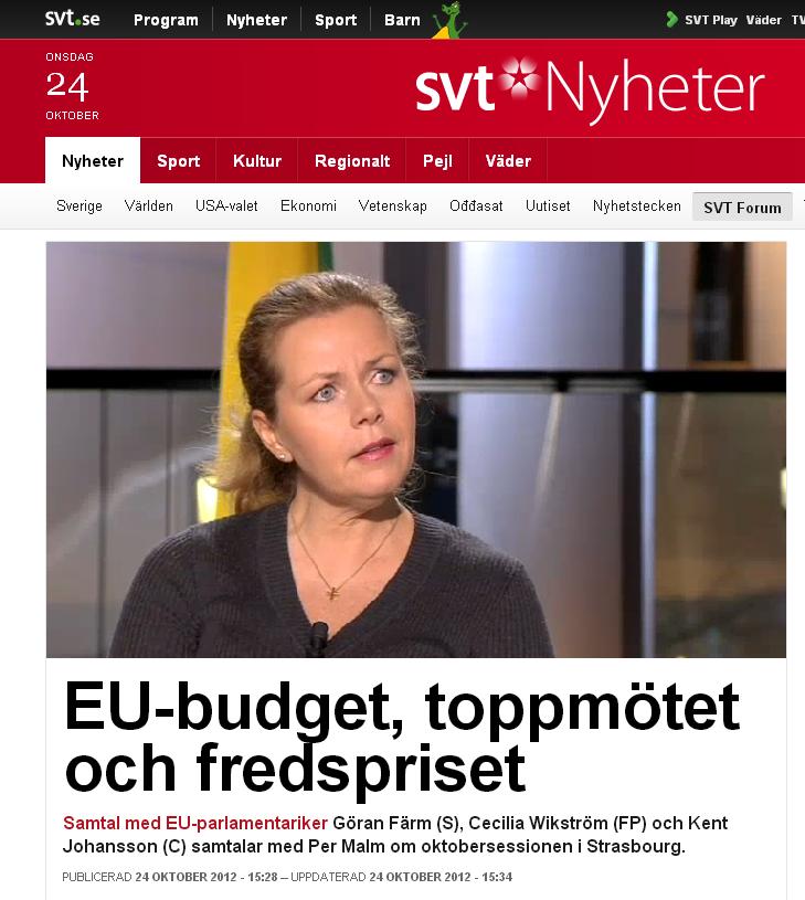 För er som missar SVT-forums sändning på fredag klockan 9.00 i SVT2 där Cecilia debatterar EU-budget, toppmöte och fredspriset med Göran Färm (S) och Kent Johansson (C), så kan ni se den redan nu. Klicka här för att se sändningen i Svtplay