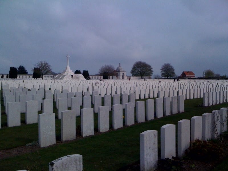 Den starkaste upplevelsen fick jag vid ett besök vid den största av dem, Tyne Cot, i Passendale. Där ligger tolvtusen unga män begravda och namnen på 35.000 finns inristade i muren som omger kyrkogården. Oerhört starkt framträdde de vita gravstenarna i solen.