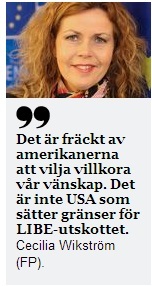 Intervjuats i både Svd och Expressen om den kommande utfrågningen i januari av Edward Snowden, visselblåsaren som läckte den information som kom att bli hela NSA-skandalen. Det har blivit känt att USA försökt stoppa Libe-utskottet (utskottet för medborgerliga fri- och rättigheter), där jag sitter, från att hålla utfrågningen och att de nu försöker vikta frihandelsavtalet mot parlamentets lydnad.