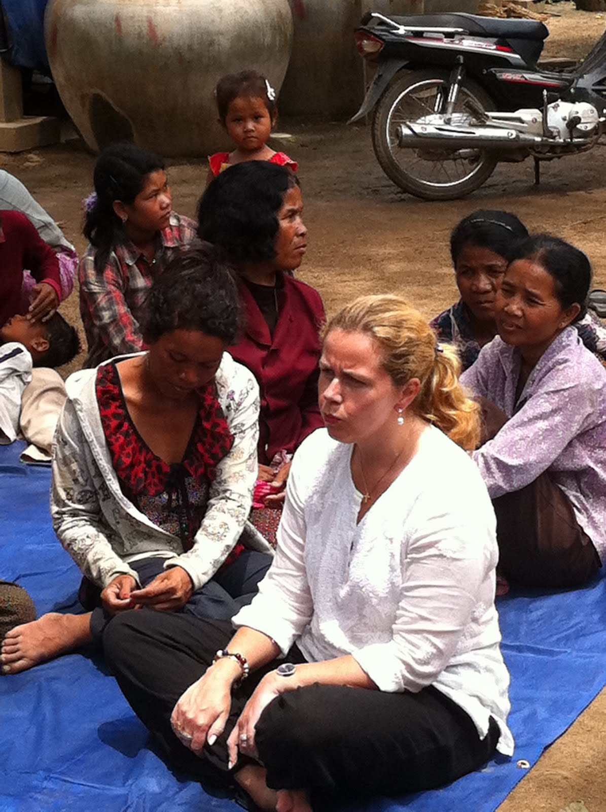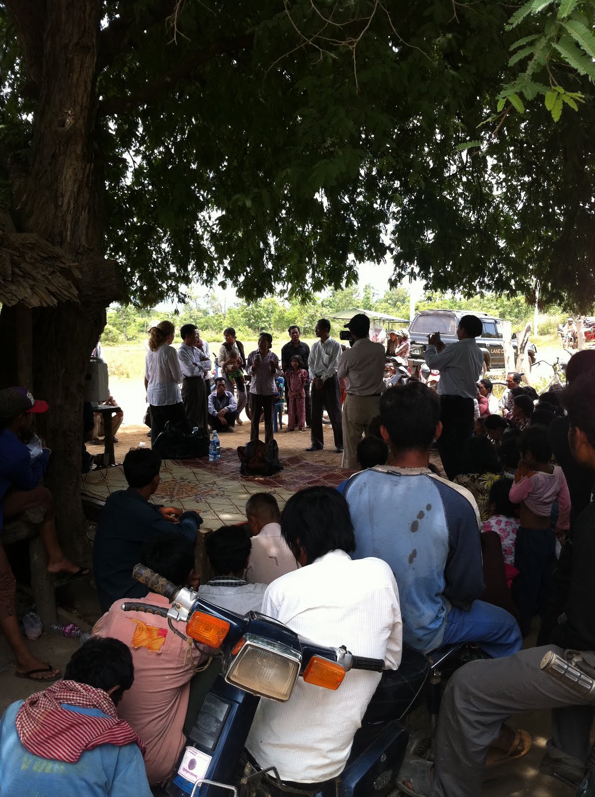 Från Phnom Penh åkte vi i jeepar ca tre timmar genom landsbygden för att komma fram till Kompong Speu. Synen som mötte där kommer jag nog aldrig att få bort från näthinnan. På marken satt ett hundratal personer som kommit för att möta mig. Sochua kunde av hänsyn till byborna inte vara med vid detta möte, eftersom hon var rädd att de skulle kunna utsättas för repressalier från regeringspartiet och dess korrupta ledning. Repressalier är just vad den man som höll i mötet utsatts för. Han har förföljts, fängslats och behandlats fruktansvärt brutalt av regeringspartiet. Ändå hör det till historien att han var medlem av detta parti, CPP (Cambodian Peoples Party) och var ungefär ”kommunstyrelsens ordförande” under flera år. Men när sockerbolagen började med sin av regeringen understödda konfiskering av fattiga människors små jordplättar, då protesterade han. Man berättade för mig hur människor från hans by stöttat honom genom att i veckor GÅ till huvudstaden för att visa honom sitt stöd! Nu mötte han mig och vi talade med alla bybor som samlats.