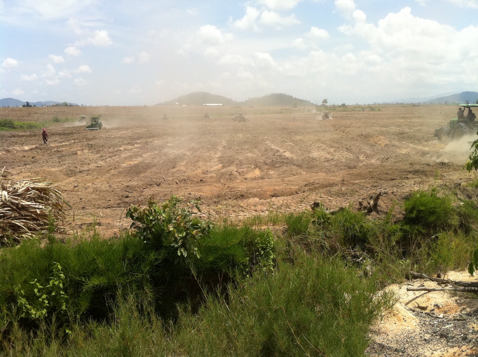 Men detta vanvett är större än man kan föreställa sig. Dessa människor är helt beroende av sitt lilla markområde för att överleva. Det är där man i generationer odlat sitt ris, haft sina palmer, husdjur och traditionella bostäder. Det var riktigt otäckt att höra hur man på en enda dag jämnat allt detta med marken. Och vi tittade förstummade på när ett tjugotal traktorer gjorde det sista på det som vi uppfattade som en jätteåker, fullständigt kal och bara brun jord så långt ögat nådde. När jag hörde berättelsen att här levde 250 familjer tills för ett år sedan kunde jag nästan inte fatta att det var sant. Sedan åkte vi en bit bort för att se en annan by som såg ut precis som den som sockerbolaget jämnat med marken. I farten förstörde bolaget dammen och brunnen också, så nu måste man gå fem kilometer bort för att hämta vatten! När jag frågade var alla dessa nu hemlösa bybor nu lever så fick jag svaret att de bor hos släktingar i byn en liten bit bort, på andra sidan vägen, för dit har sockerbolagen ännu inte kommit med sina koncessioner som tvångsmässigt fördriver människor från hus, jordar och hem.