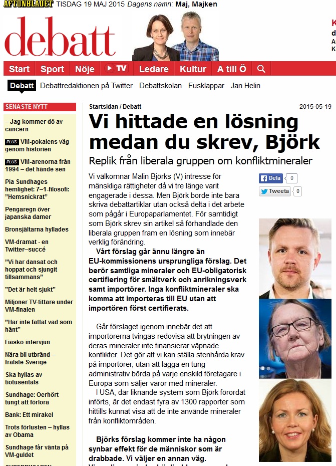 Vi liberaler har nu tagit fram ett förslag som går ännu längre än EU-kommissionens ursprungliga förslag. Vårt förslag berör samtliga mineraler och EU-obligatorisk certifiering för smältverk och anriktningsverk samt importörer. Det innebär att inga konfliktmineraler kan komma att importeras till EU utan att importören först certifierats.