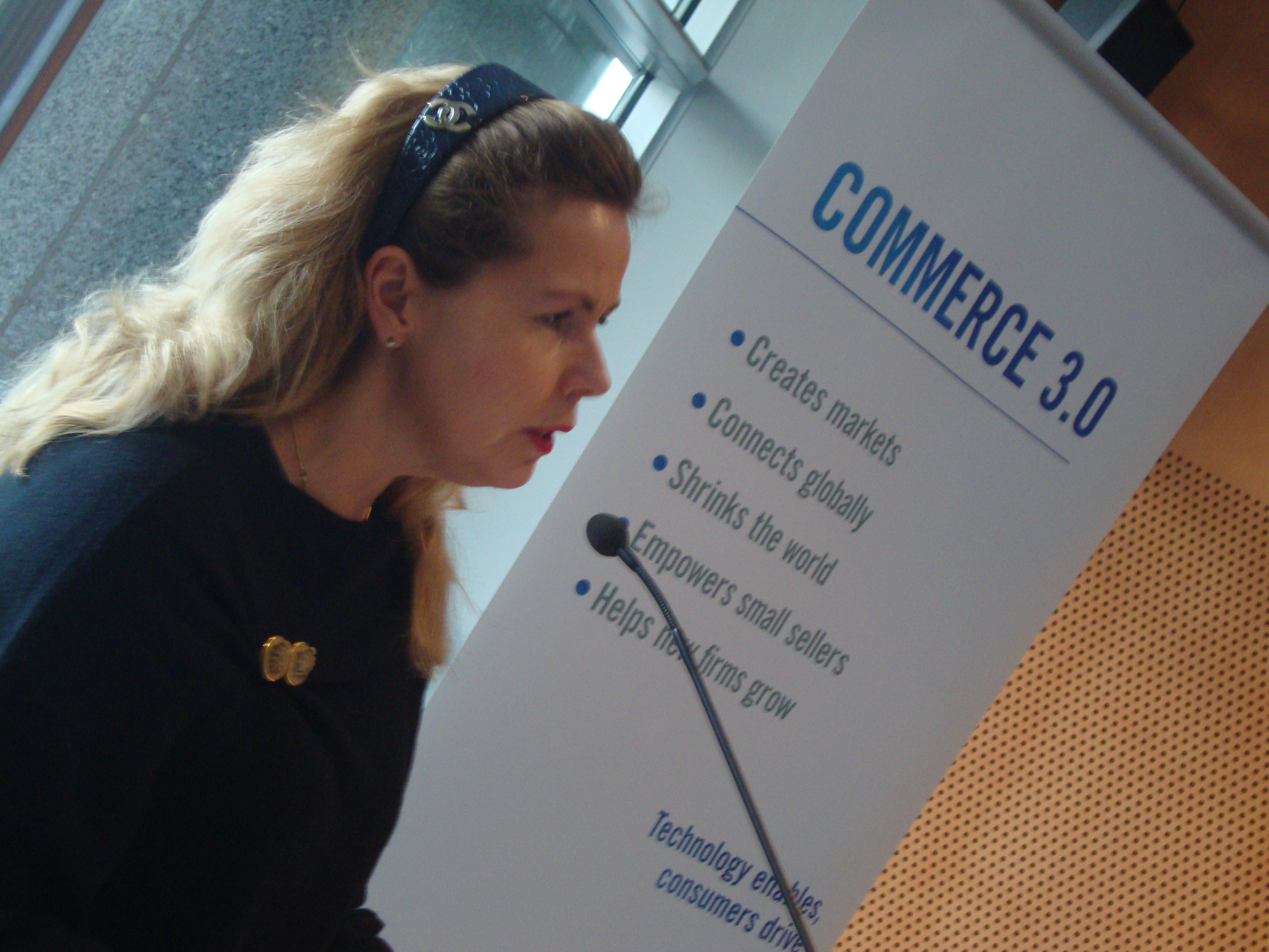 - Köper jag ett halsband från ett brittiskt företag på nätet och får vänta flera veckor innan jag får sätta på mig det, på grund av en seg leveranskedja, så förlorar e-handeln sin tjusning. Genom ett effektivare leveranssystem, mer enhetlig moms för hela EU och förenklade tullförfaranden skulle småföretagarna kunna vidga sin marknad, också utanför EU. Den ökade handeln skulle snabbare ta oss ur den ekonomiska krisen, säger Cecilia bland annat just nu på konferensen.