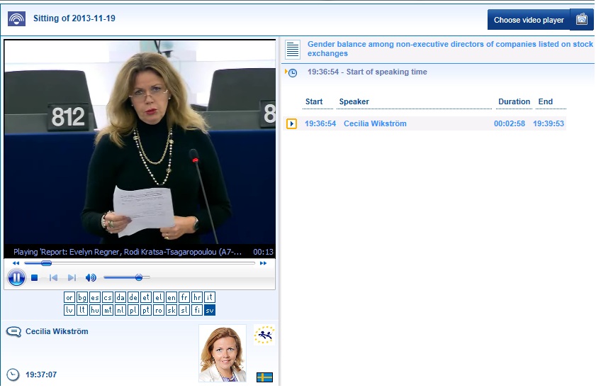 EU-kommissionen består av 19 män och 9 kvinnor. Den europeiska centralbanken, ECB, där vi faktiskt kunde påverka sammansättningen, liknar sin saudiarabiska motsvarighet vad gäller representation av kvinnor. Där finns inte en enda kvinna i styrelsen. Trots detta tar vi oss rätten att peka med hela handen och tala om hur fria europeiska börsbolag ska tillsätta sina styrelser. Detta är inget annat än ett stort hyckleri, säger jag bland annat i mitt tal i plenum inför dagens omröstning.