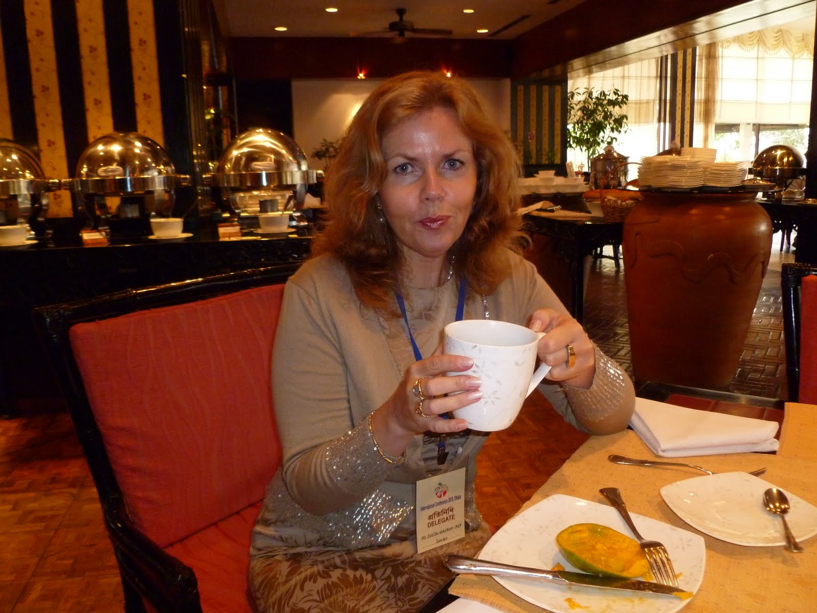 Cecilia with a cup of tea at the hotel Pan Pacific Sonargaon before heading to the conference